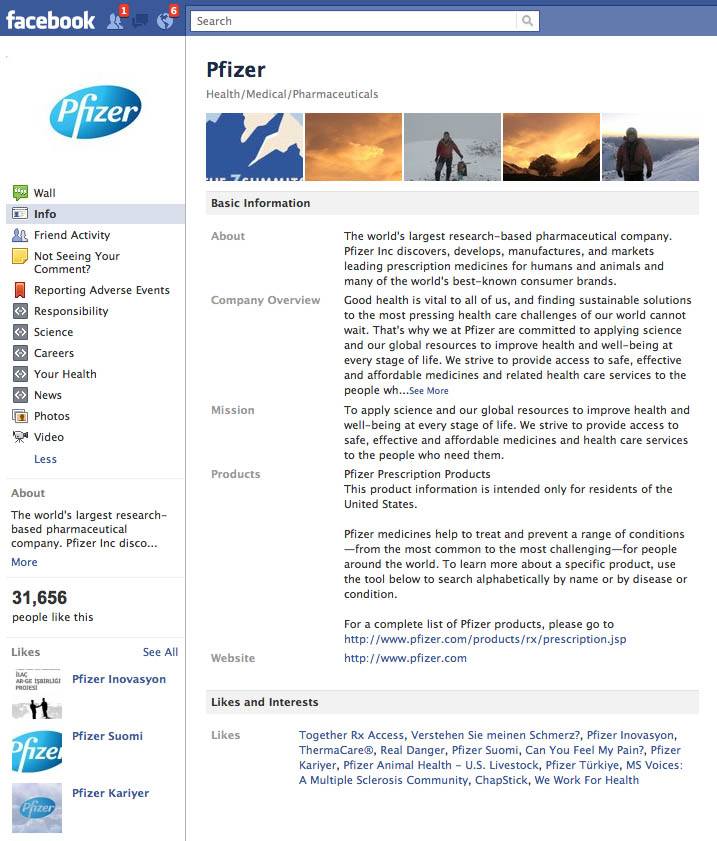 Pfizer’s page is an example of the sameness seen in almost every Facebook page created by dolts like you and me who cannot afford to allocate resources on customizing our pages. It’s what I call “social media socialism” — the least common denominator available to all users (regardless of their ability or resources) that satisfies a minimal need: ie, to have a presence on Facebook.