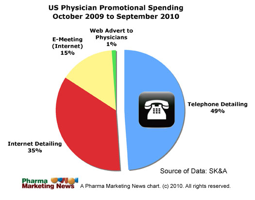SK&A says that “tele-detailing” accounts for 49% of the new media channel physician promotional spend, whereas “Internet Detailing” is only 35% and Web advertising is a meager 1% (see chart below).