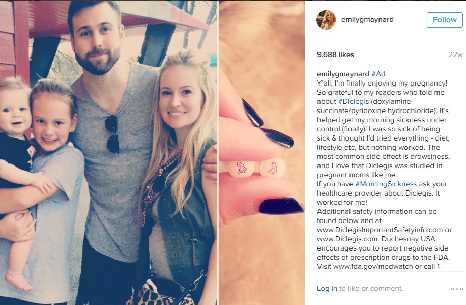 About 22 weeks ago, Emily Maynard Johnson, who appeared on ABC’s The Bachelor and The Bachelorette, posted the following Diclegis promotion to her Instagram account: