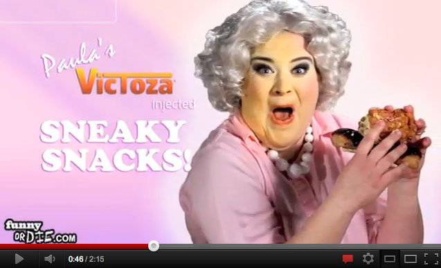 “All of my desserts are injected with Victoza to lower my blood sugar and keep me immortal,” says “Paula Deen” in the spoof YouTube “Paula Deen’s Diabetes Ad” posted by Funny or Die (see video here).