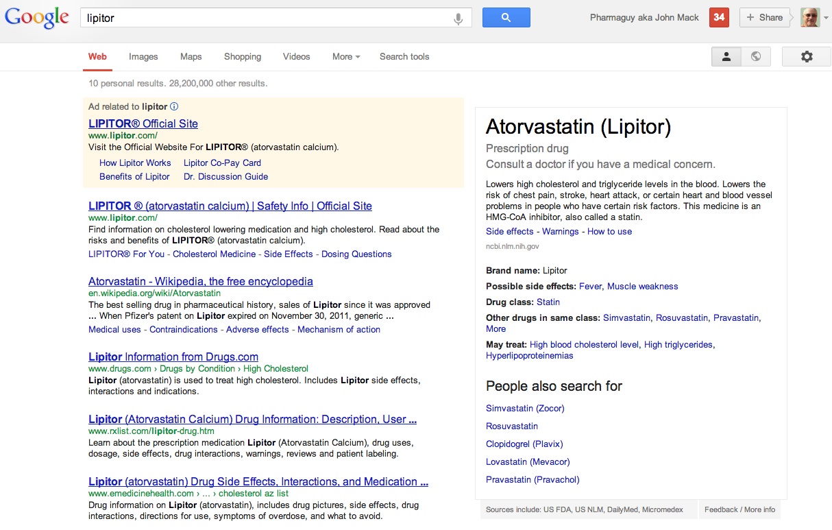 I just learned that Google has gone one step further. Instead of a small adword-type box near the top of the search results page (i.e., BELOW the paid ad, if any), there is a large box on the upper right-hand portion of the page that includes a lot more information. The following screen shot illustrates the size and placement of the new “sidebar” drug information box on the search results page for Lipitor (click the figure for an enlarged view).