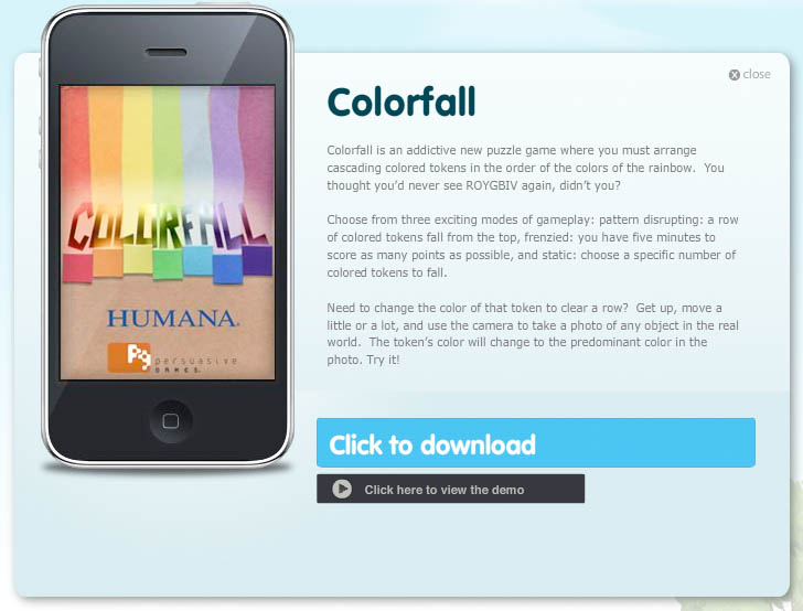That’s an interesting goal for an iPhone app worthy of further investigation. So I went to the Humana Games for Health Web site and found this promo for the Humana iPhone game app called “Colorfall”: