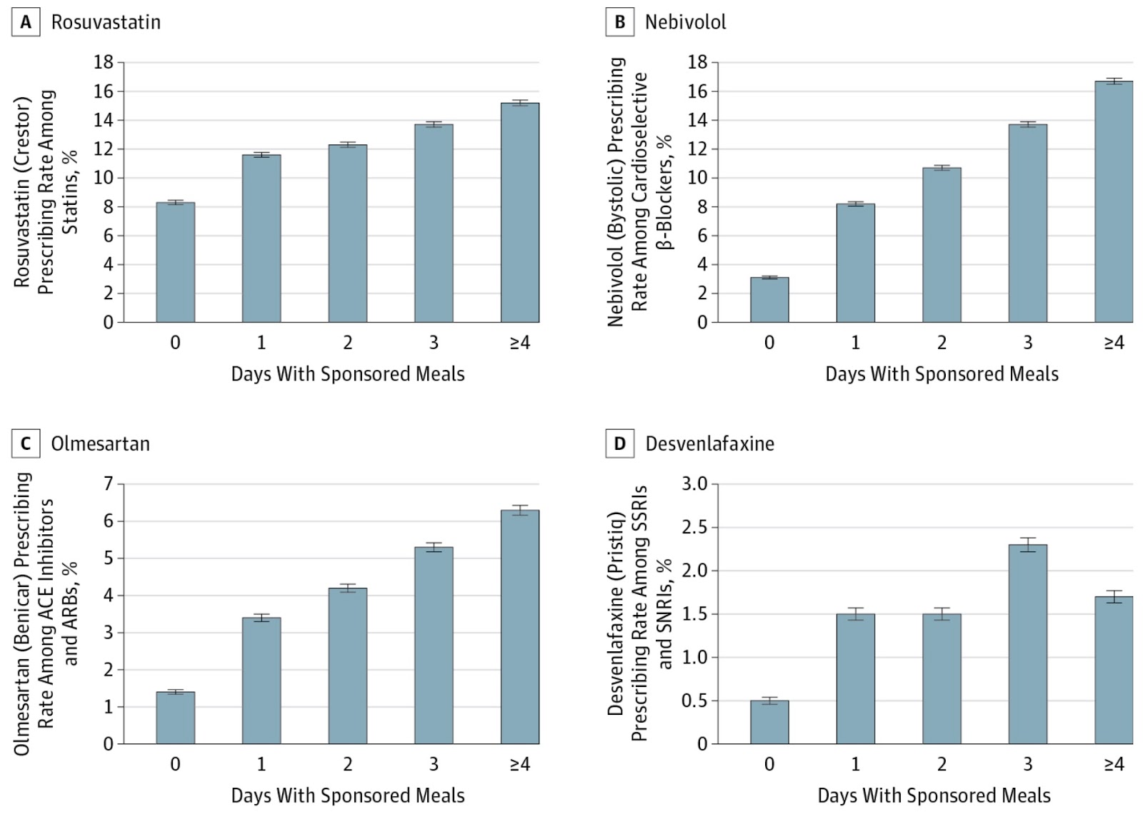 Physicians who received meals related to the targeted drugs on four or more days prescribed rosuvastatin at 1.8 times the rate of physicians receiving no target meals, nebivolol at 5.4 times the rate, olmesartan at 4.5 times the rate, and desvenlafaxine at 3.4 times the rate, according to the results. Physicians who received only a single meal promoting the four target drugs also had higher rates of prescribing those medications, the results suggest. And as the chart below shows, additional meals and costlier meals were associated with higher prescribing rates.