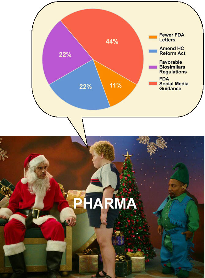 (1) Left over from last year’s list: Guidance from the FDA on how it will regulate drug promotion on the Internet and social networks. This, of course, is the most important item on the list. In last year’s letter to Santa (find it here) pharma said: “Do I need to mention how much we would like guidance from the FDA on how it will regulate drug promotion on the Internet and social networks? Right now, we are really hurting because we cannot advertise on Google.”