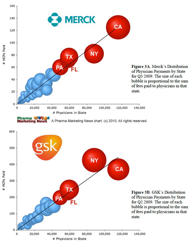 In the January issue of Pharma Marketing News, which will be published today, one article focuses on payments made to physicians by Merck, GSK, and Lilly (see “Pharma Begins to Reveal Payments to Physicians: Analyzing the Numbers to Spread the Sunshine“). Figures 2 and 3 from that article are reproduced below:
